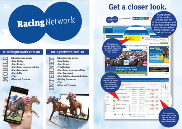 The Racing Network is a four screen digital experience consisting of a dedicated IPTV channel, a powerful and exciting online and mobile destination that offers best-of-breed Australian thoroughbred racing information and multimedia content from TVN (ThoroughVision), Best Bets and editorial support from Telstra Media Sports team.