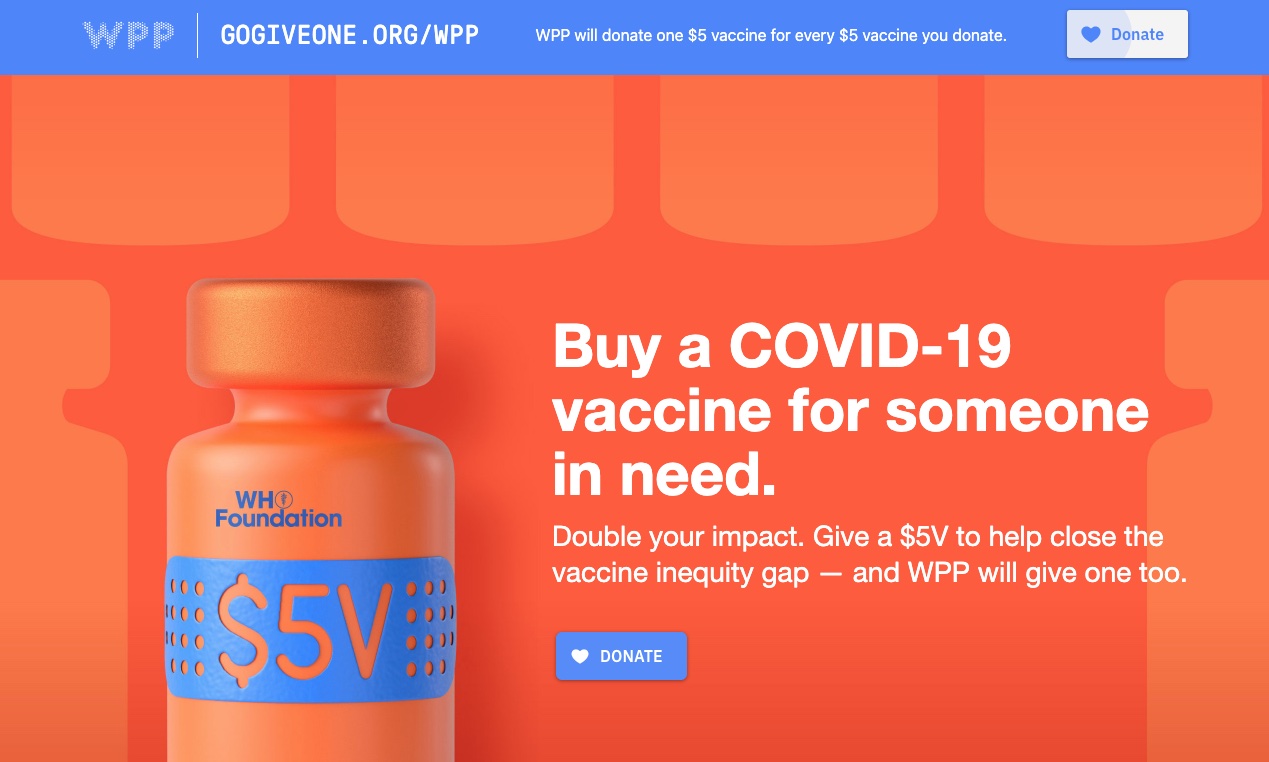 As well as creating and delivering the pro bono $5V campaign (thanks to Ogilvy, Blue State, Landor & Fitch and GroupM), WPP is donating 10,000 vaccines on behalf of our clients, and will match every $5V bought by our own people.