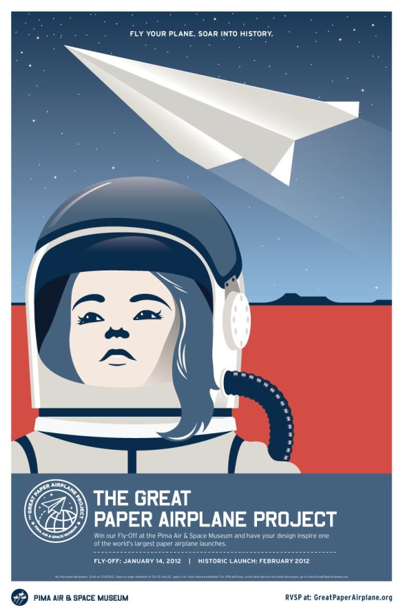 At the end of a month of paper airplane construction and practice sessions, the first 300 children between the ages of 6 and 14 who sign up on the www.GreatPaperAirplane.org website will be eligible to compete to see whose paper airplane can fly the furthest. The competition begins at 11 a.m., Saturday, January 14, 2012, at the Pima Air and Space Museum, 6000 E. Valencia Rd.