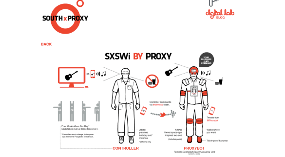 Basically Proximity is sending a proxy for you to SXSW Interactive in Austin so you can experience the most popular interactive conference in the world from home or work. As well as this a few lucky people will be chosen to remotely control the Proxybot via Twitter. They’ll decide which sessions and which parties to attend.